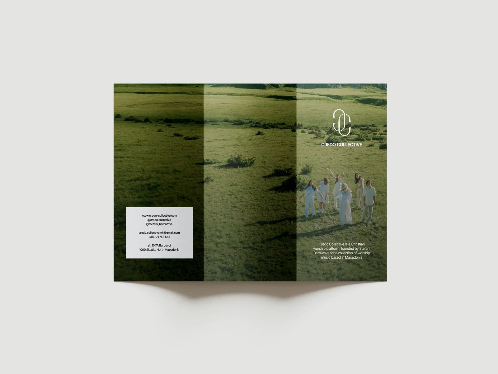 The brochure design for Credo Collective was built around the idea of unity and openness. We used natural imagery and soft tones to reflect authenticity and faith, combined with a minimal layout to maintain focus on the message rather than decoration.